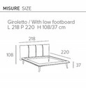 Misure : Larghezza 218 Profondità 220 Altezza: testata 108 pediera 37. Rete consigliata 180x200 ( esclusa).